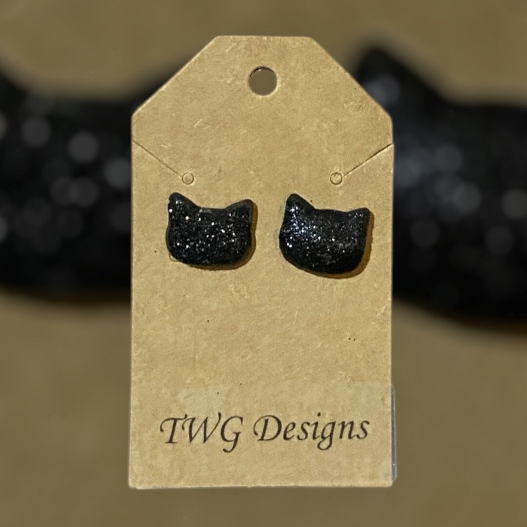 Black glitter resin cat head stud earrings. Stainless steel posts.